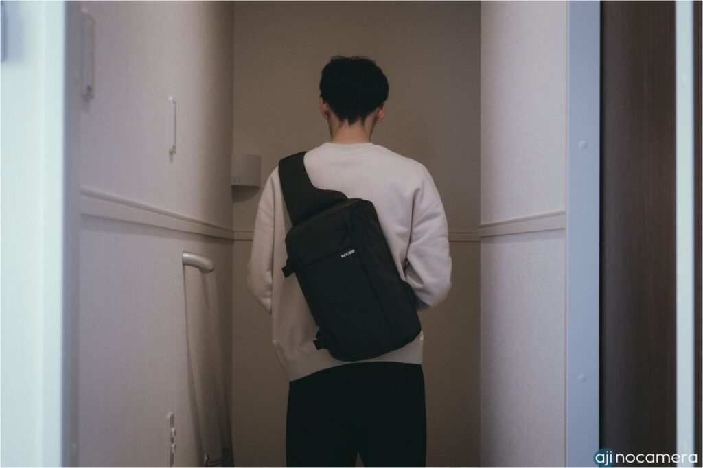 さすがに前掛けできるスリングバッグのほうが取り出し安くはありますが、このバッグでも片方の肩に肩紐をかけながら、さっとカメラを取り出して撮影ができます。