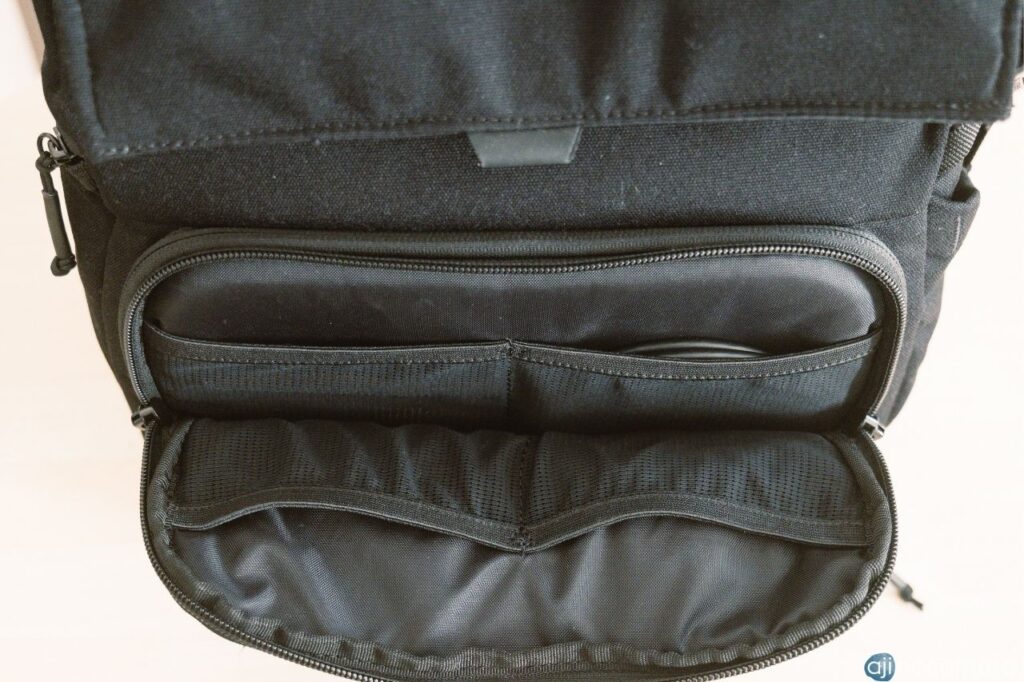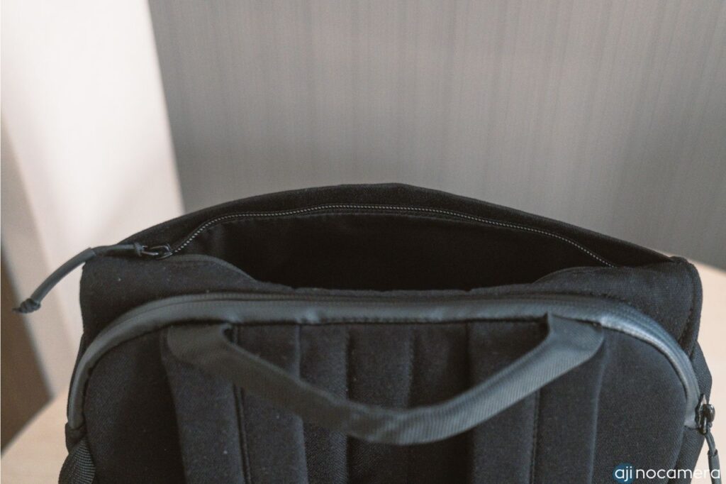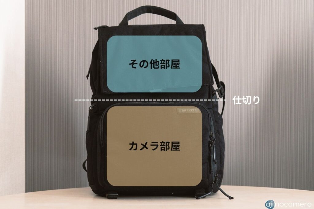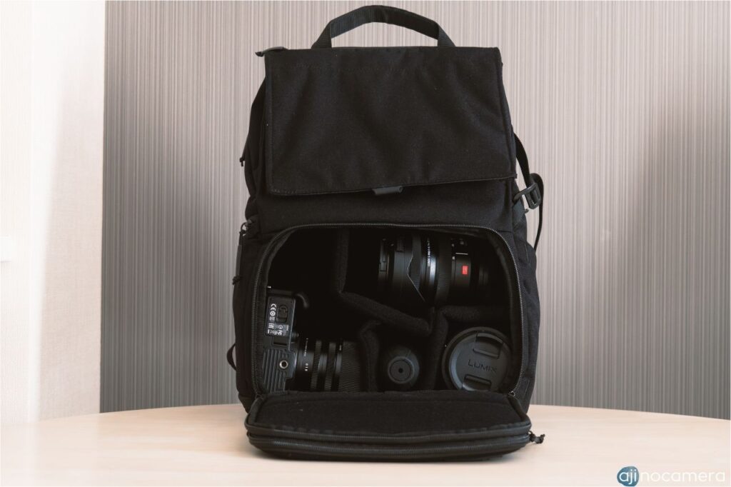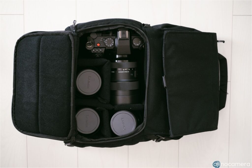 バッグ上面のフラップから開くメイン収納部は上下に仕切ることができ、上部はフリースペース、下部はカメラやレンズの収納スペースと2部屋にわけることができます。