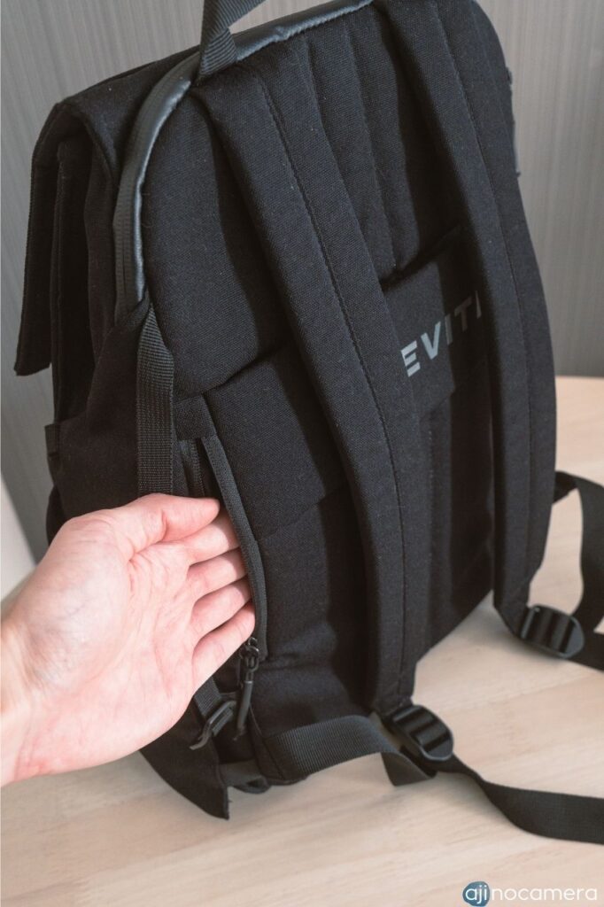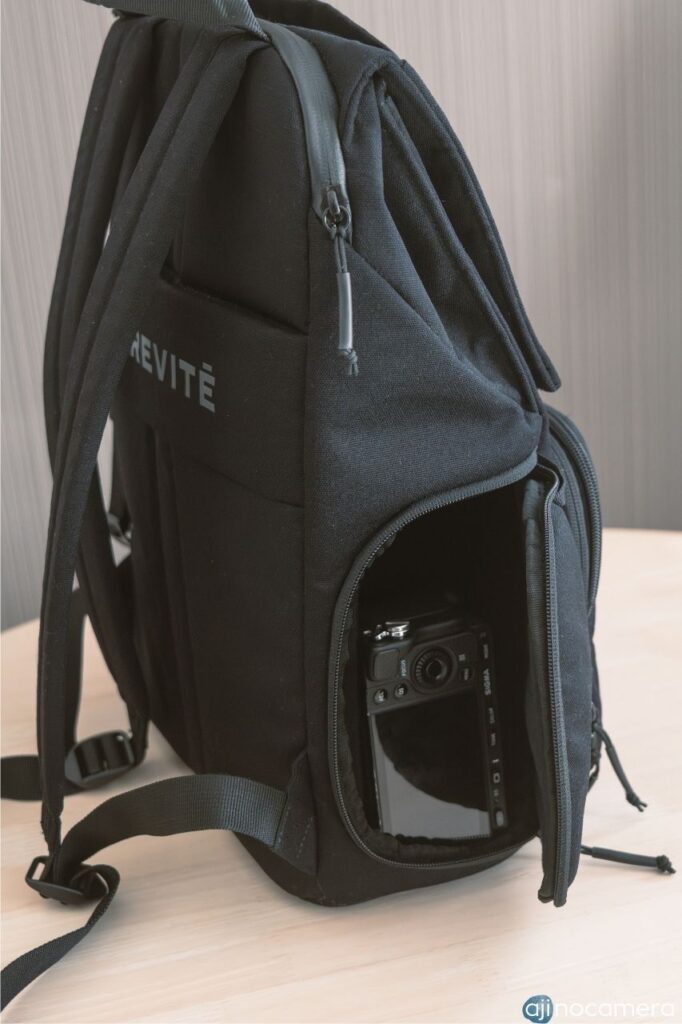バックパックタイプのカメラバッグでは一般的なサイドアクセス。正直、あまり使い勝手は良くないのでは…と思っていましたが、問題なく使えました。