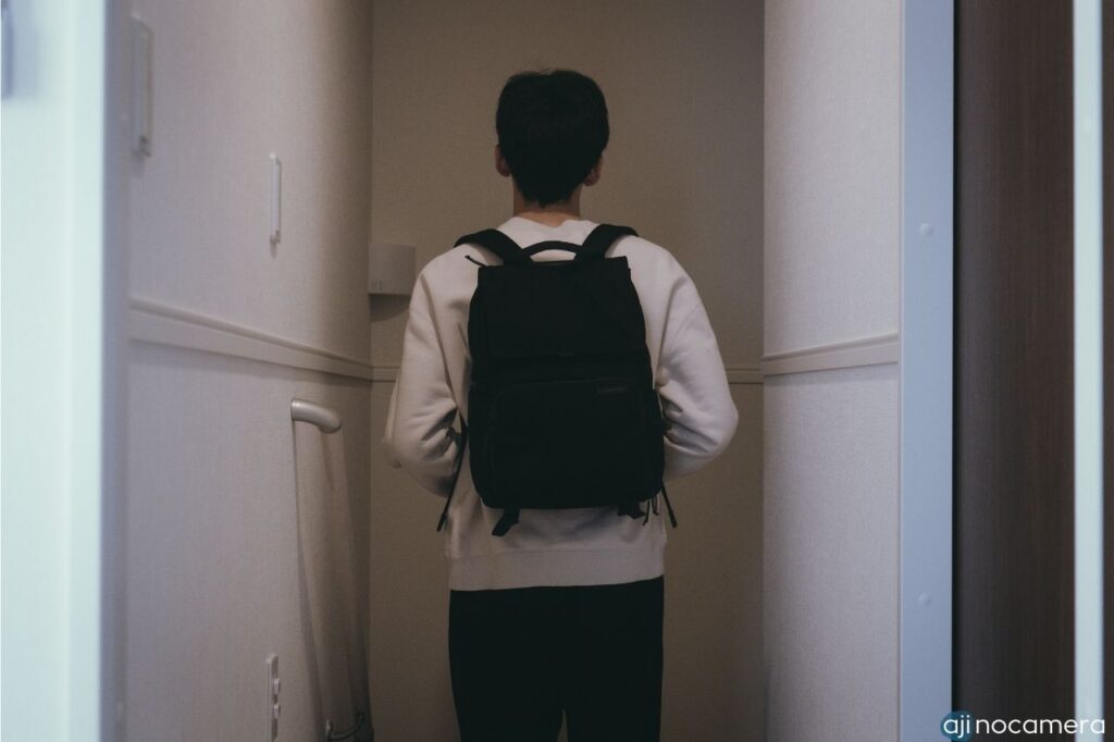 素材と色的にホコリが少し目立つのが若干気になるところですが、黒一色で無駄な装飾がなく、街中で背負っていても違和感がない都会的な雰囲気です。