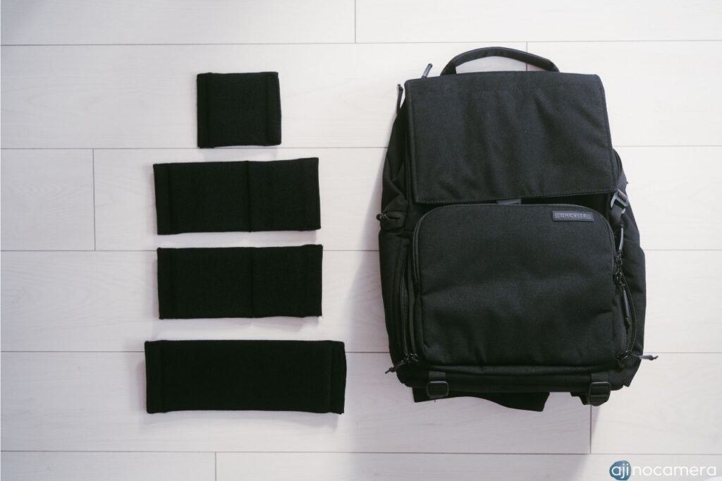 仕切りはベルクロで自由に調整可能。カメラボディ、レンズ数本、ストロボなど、自分の機材にあわせてカスタマイズできます。仕切りはクッション性が高く、機材をしっかり保護してくれる安心感があります。