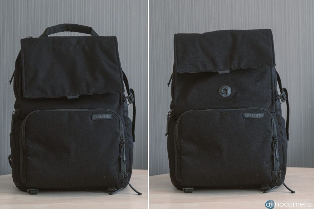 また、上部のフラップは止める場所を変えることができ、気休め程度ですが容量を変更できます。