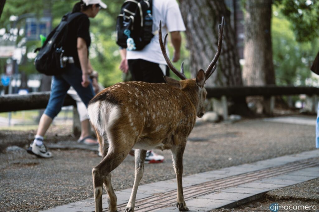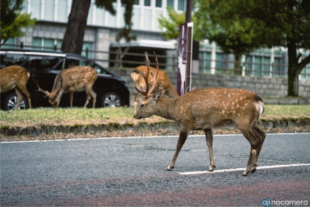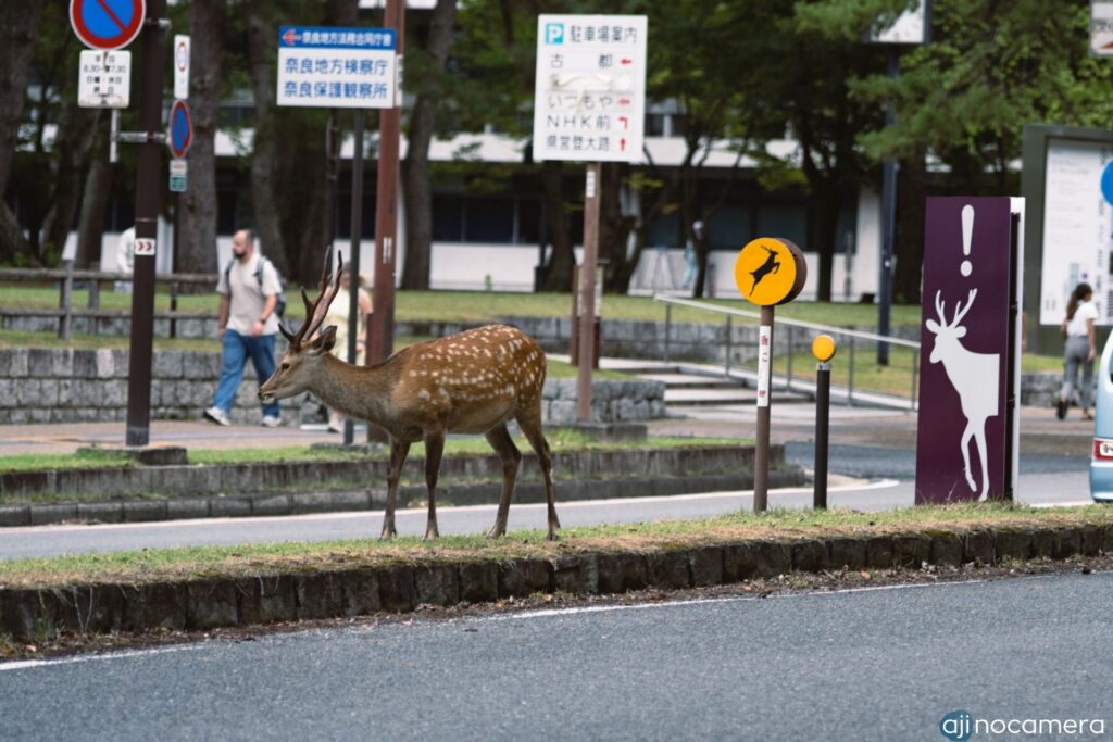 ここからは鹿のターン。奈良公園にいかずとも、近鉄奈良駅を少し東に歩くと、歩道も車道も関係なく鹿が闊歩している。