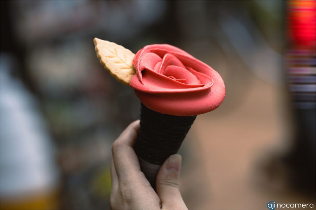 ただ、ホテル日航奈良に戻る途中にもう一軒。たこ焼き八兵衛さんに寄り道。ここではたこ焼きではなく、バラにそっくりと話題のローズレッドストロベリーソフトクリームが目当て。